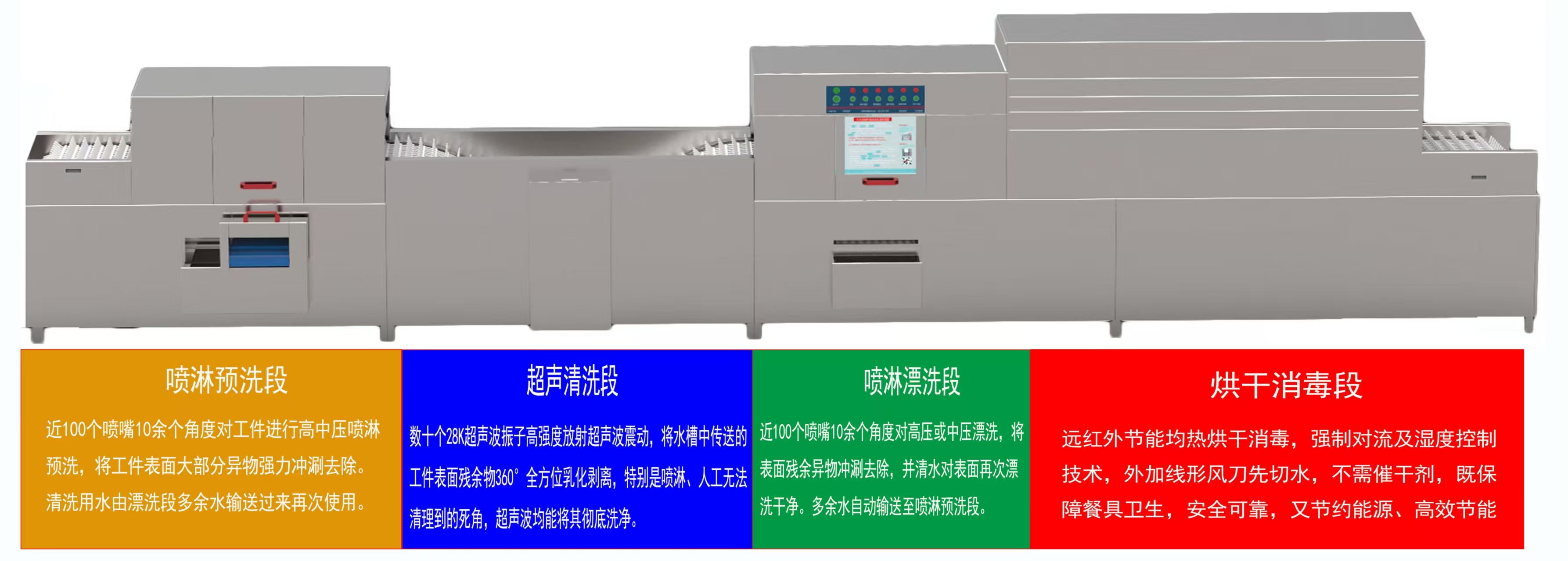 上超大型商用洗碗機-不需人工預洗,節約人工 勞動強度大:員工需手動刮除頑固污漬,日均彎腰操作超500次,導致肌肉勞損和人員